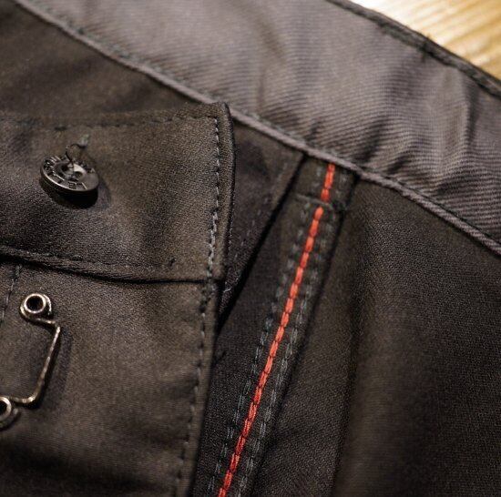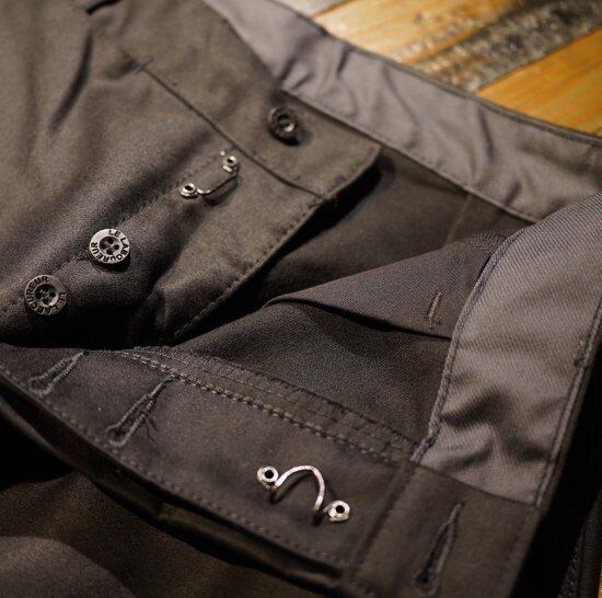 フロントのボタンフライ部分にフックをデザインとして施してあり、ラブルールの特徴的デザインとなっている。